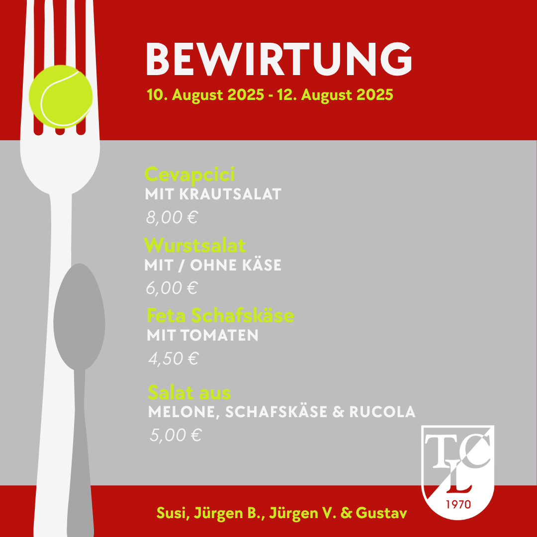 Bewirtung 10.08-12.08 10.08-12.08.2025Speisen und Getränke Cevapcici mit Krautsalat Wurstsalat Feta Schafskäse mit Tomaten Melone-Schafskäse-Rucola Salat TeamSusi, Jürgen B., Jürgen V., Gustav Paul-David Sträter2025-08-07T09:40:24+00:00